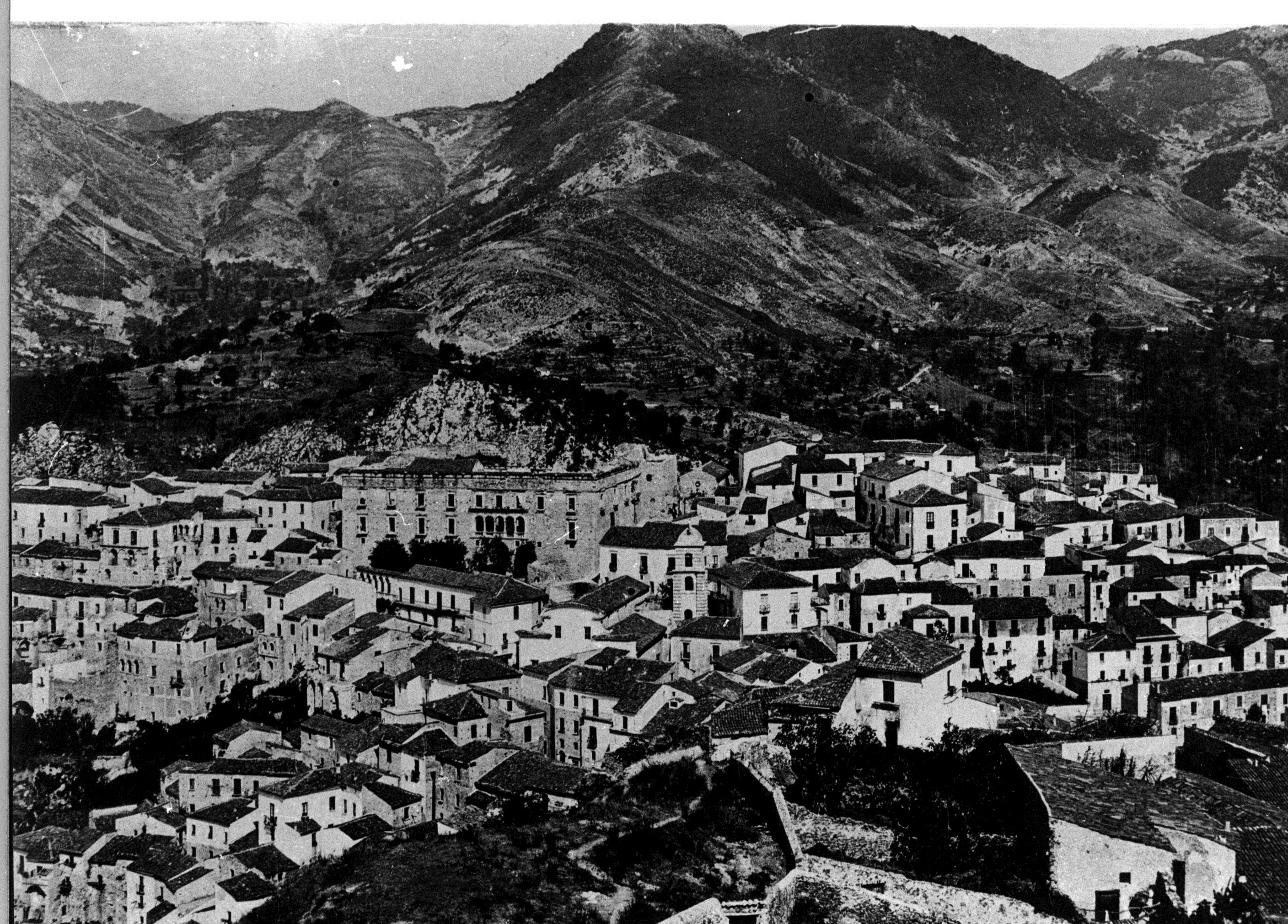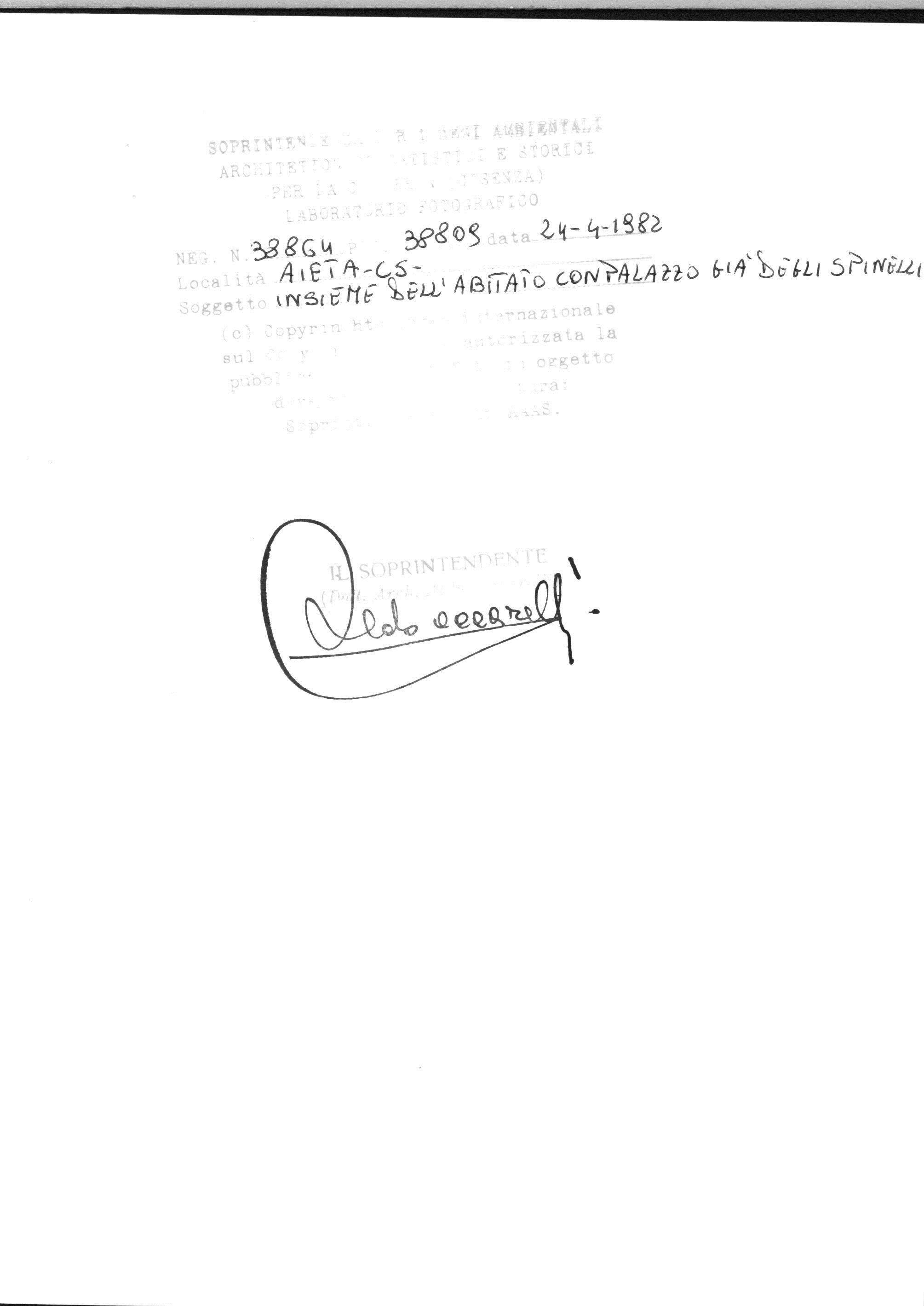 Aieta (Cosenza): insieme dell’abitato con Palazzo già degli Spinelli. Il verso della foto reca la seguente iscrizione: “Soprintendenza per i beni ambientali architettonici artistici e storici per la Calabria (Cosenza) Laboratorio fotografico/neg. n. 38864 pos.38809 data 24-4-1982/località Aieta –CS- /soggetto: Insieme dell’abitato con Palazzo già degli Spinelli/ (c) Copyrights legge internazionale sul copyrigths. Se è autorizzata la/pubblicazione della foto in oggetto/deve riportare la dicitura: / Soprint. per i Beni AAAS./Il Soprintendente /(dott. a. arch. Aldo Ceccarelli)”.
