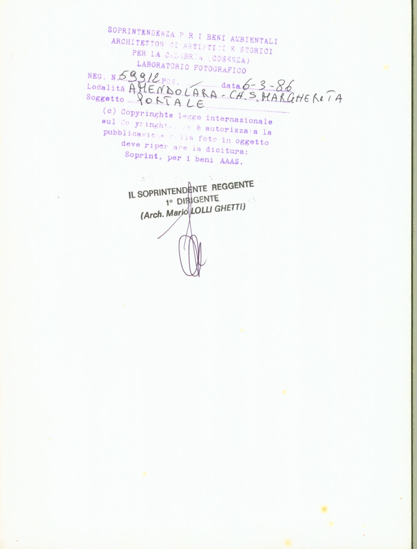 Timbro sul verso: Soprintendenza per i beni ambientali architettonici artistici e storici per la Calabria (Cosenza) / Neg. N. 59912 Pos. / data 6-3-86 / Località Amendolara - Ch. S. Margherita / Soggetto: Portale [...] Il Soprintendente 1° Dirigente (Arch. Mario Lolli Ghetti)".