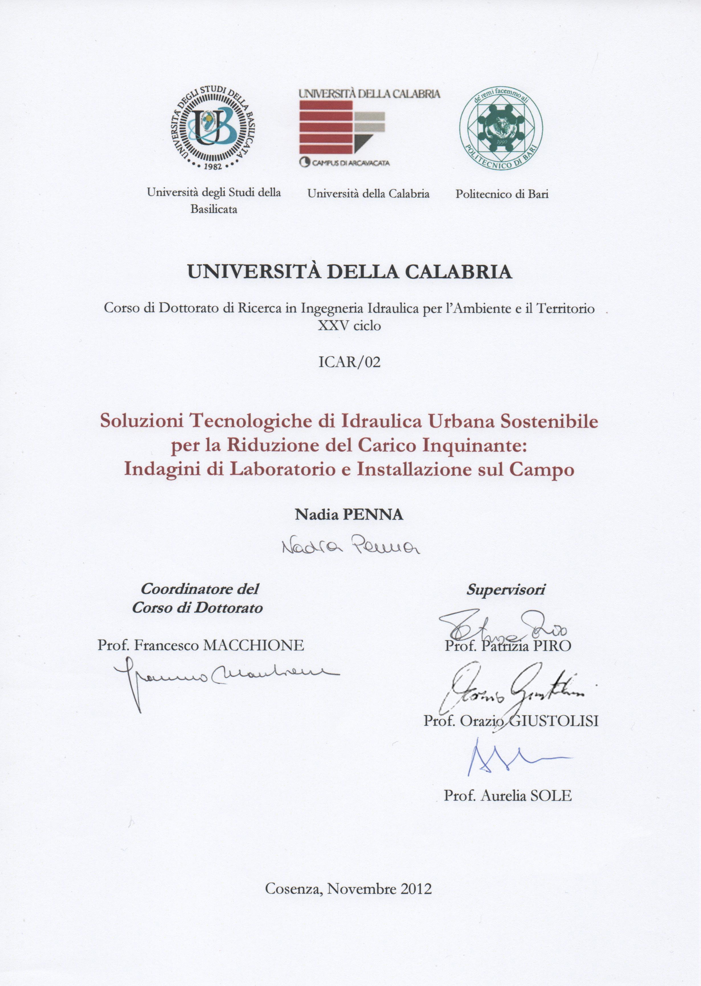 Dottorato di Ricerca in Ingegneria Idraulica per l’Ambiente e il Territorio, Ciclo XXV, a.a. 2012