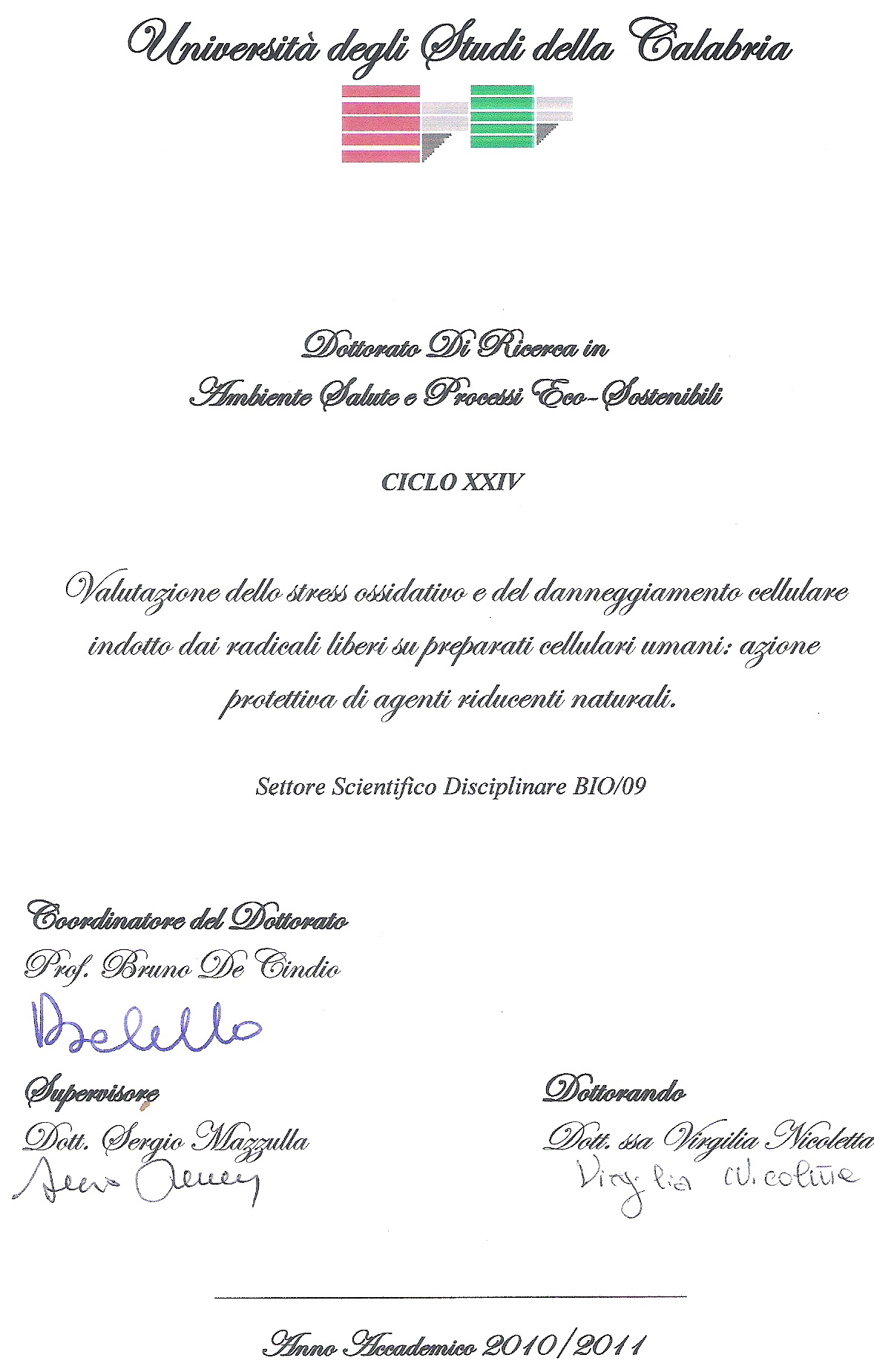 Dottorato di Ricerca in: Ambiente Salute e Processi Ecosostenibili, Ciclo XXIV, a.a. 2010-2011